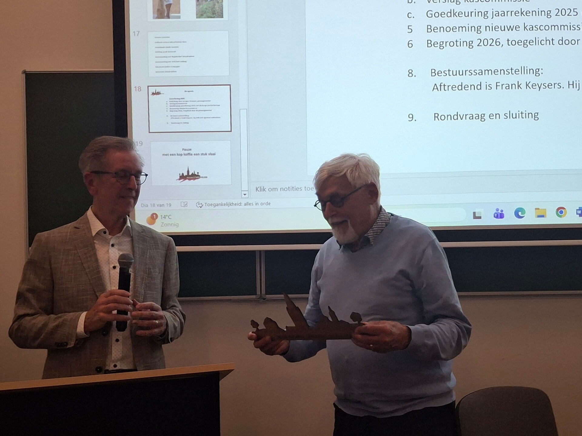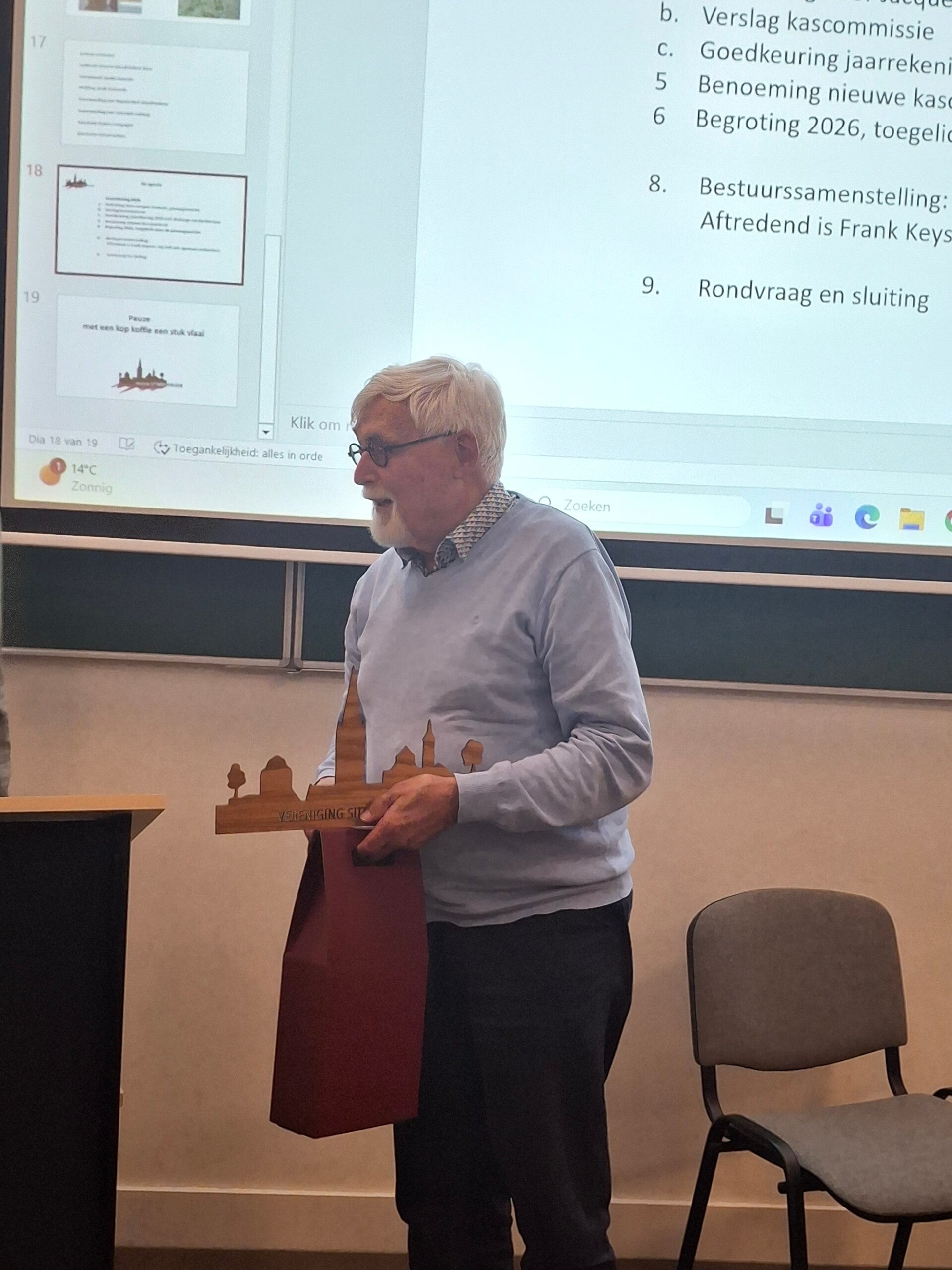 Voorzitter Frank Keysers opent de vergadering en heet iedereen welkom. Voor de pauze wordt door de secretaris Marijke geilen het jaarverslag 2025 doorgenomen met behulp van een PowerPoint. De penningmeester, Jacques Meeuvis, neemt ons mee in de financiële wereld van de vereniging.