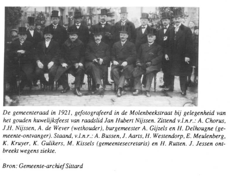 Bovenstaand carnavalsliedje werd geschreven in 1920 en de maker van het lied had kennelijk geen positief idee van de gemeenteraad van Sittard in die tijd. Het woord “puime” betekent dan ook “waardeloos” en in zijn droom laat Jozef alle gemeenteraadslieden oppakken en meenemen door Sinterklaas. Carnaval in 1920 Dat jaar werd het seizoen geopend met een gekostumeerd liefdadigheidsbal. De opbrengst was bestemd om de arme kinderen met Sinterklaas een cadeautje te kunnen geven. Het was crisistijd en niet iedereen had het even breed. De bevolking gevraagd om zoveel mogelijk spullen te brengen naar het gebouw van Franciscus Solanus aan de Oude Markt. Op zondagochtend mocht iedereen komen kijken naar de goede gaven waarna ze´s middags verdeeld werden onder de armen. Alhoewel de wereldeconomie er slecht voor stond werd besloten om dit seizoen na 11 jaar toch weer een optocht te organiseren. Politiek 1920 In 1919 veranderde er veel in de gemeentepolitiek. Voor het eerst was het kiesrecht niet meer gebonden aan inkomen en kregen alle mannen kiesrecht. (Vrouwen kregen dit pas in 1923). Tot 1919 deden de kandidaten aan de verkiezing mee op persoonlijk titel en waren afhankelijk van hun eigen populariteit. Een aantal gratis pilsjes was zeer bevorderlijk voor deze populariteit en leverde algauw extra stemmen op. In 1919 veranderde de samenstelling van de bevolking door de komst van de mijnen; er kwamen meer andersdenkenden. Nu iedere man stemgerechtigd was kon dit een gevaar betekenen voor de samenstelling van de gemeenteraad die tot dan toe bestond uit overwegend katholieke kandidaten. Met de komst van deze “vreemde” arbeiders zou het moeilijker worden om op basis van naamsbekendheid gekozen te geworden. Mede gesteund door de kerk besloten de katholieken zich daarom te verenigen en maar liefst 7 van de 11 zittende raadsleden namen plaats op de eenheidslijst van de Katholieke Kiesvereniging. Samenwerking gaf een grotere kans op behoud van het raadslidmaatschap. Johannus Aarts, oprichter van de partij werd lijsttrekker. De vier overige raadsleden kwamen met een eigen lijst uit. De volgorde op de lijst werd bepaald door loting. Ondanks de oproep om principieel op nummer 1 te stemmen kwam een aantal mensen toch met voorkeurstemmen in de raad. De Katholieke Kiesvereniging boekte een groot succes bij de verkiezing mede dankzij de oproep van de geestelijkheid. Zij kregen hierdoor maar liefst 10 van de 13 raadszetels. Men was ontevreden met het systeem en het gevolg was dat er bij de volgende verkiezing in 1923 geen 5 verschillende maar liefst 14 verschillende lijsten waren; een aantal kandidaten had een eigen partij opgericht. De gemeenteraadsleden De volgende gemeenteraadsleden komen voor in het liedje: Karel Gulikers 1919-1923 Henri Rutten 1919-1941 K.W. Kruijer 1919-1924 Eugene Meulenberg 1919-1927 Alex de Wever1919-1925 H.J. Westendorp 1919-1921 Jean Nijssen 1919-1923 Sander Bussen 1920-1923 Henri Delhougne 1919-1927 Sjang J.W. Jessen 1919-1924 Lambert Keijsers 1919-1924 De foto werd gemaakt in 1921 in de Molenbeekstraat bij gelegenheid van het gouden huwelijksfeest van raadslid Jan Hubert Nijssen. Zittend v.l.n. r. A. Chorus, J.H. Nijssen, A. de Wever (wethouder), burgemeester A. Gijzels en H. Delhougne (gemeenteontvanger) Staand v.l.n.r. A. Bussen, J. Aarts, H. Westendorp, E. Meulenberg, K. Kruijer, K. Gulikers, M. Kissels (gemeentesecretaris) En H. Rutten. J. Jessen ontbreekt wegens ziekte.